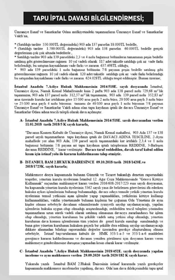Kamuoyunda uzun süredir merak edilen davanın geçmişi 2014 yılına dayanıyor. Ümraniye Esnaf ve Sanatkarlar Odası, kendi mülkiyetindeki bazı taşınmazların gerçek değerlerinin çok altında fiyatlarla Ümraniye Esnaf ve Sanatkarlar Vakfı’na devredildiğini tespit ederek, hukuki süreç başlatmış.