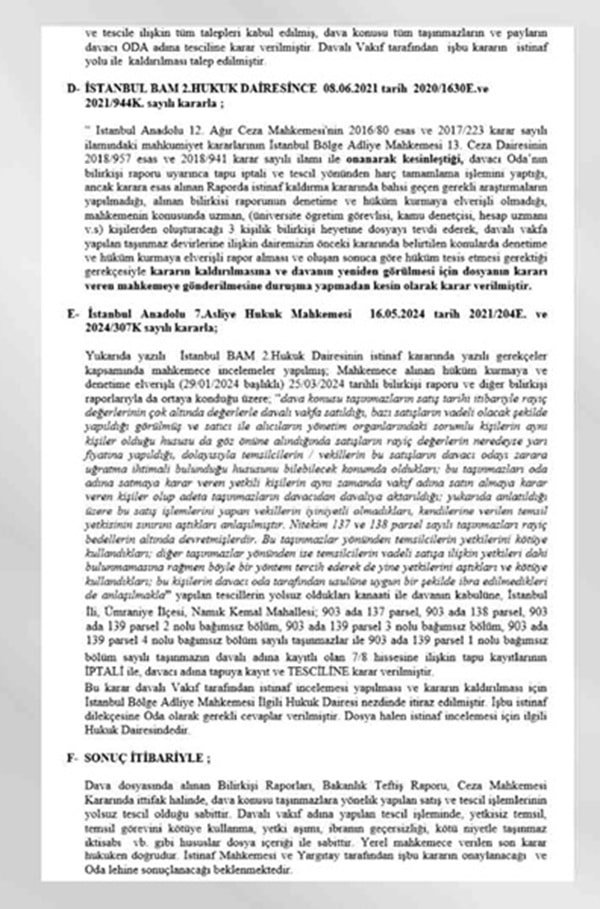 - 2024:Mahkeme, bilirkişi raporları ve denetim sonuçlarına dayanarak tüm taşınmazların Oda adına tesciline karar verdi.